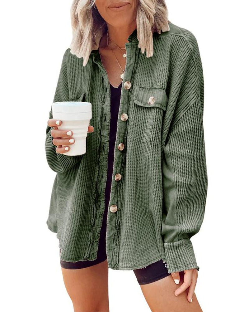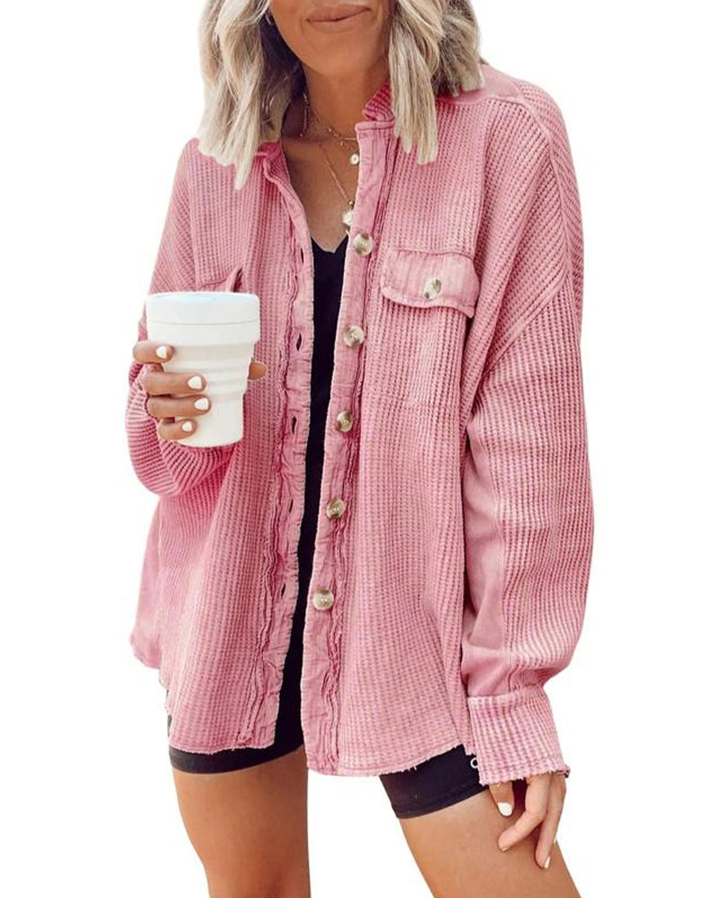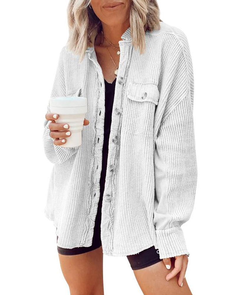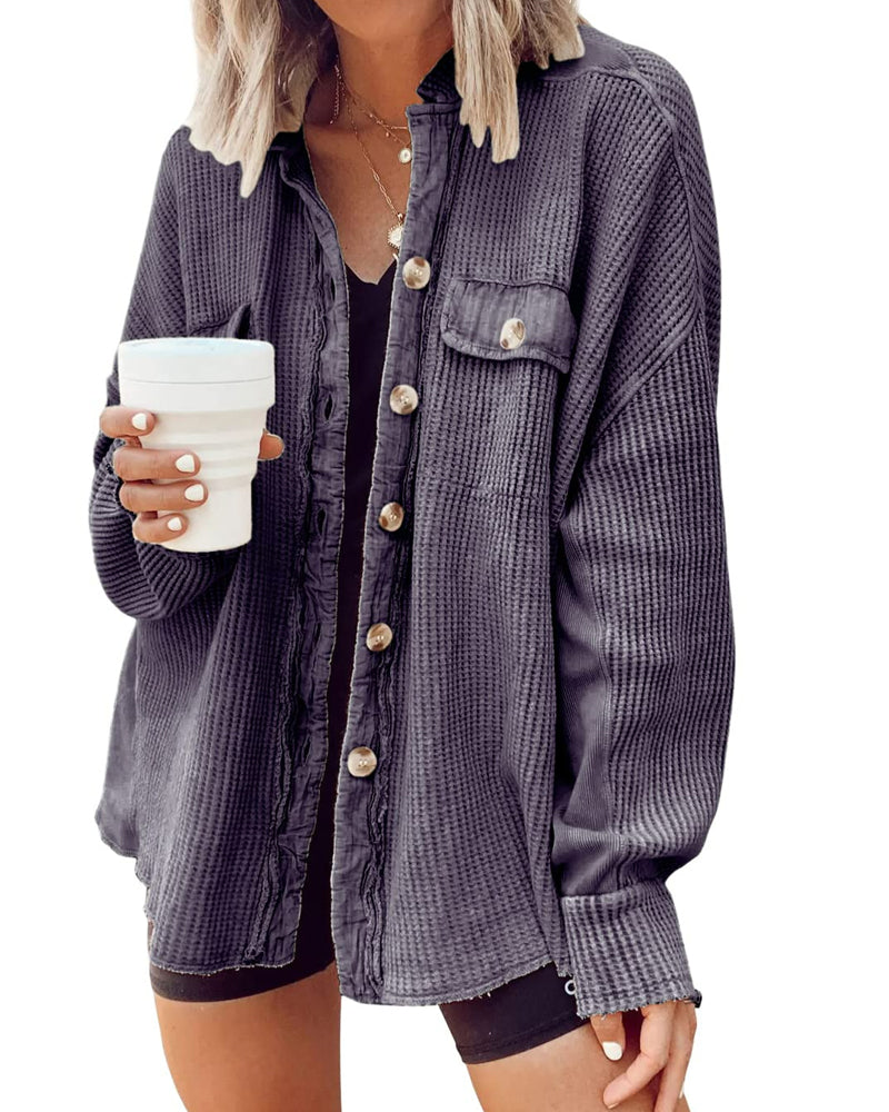 Casual and loose fit boyfriend shirt jacket, made of high quality and textured waffle knitted material; Suit for spring, fall and warm winter wear