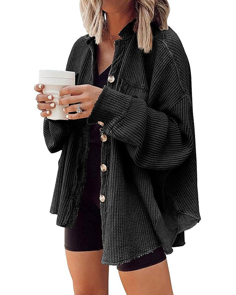 Waffle knit shacket jacket for women featuring slouchy batwing sleeve and distressed spliced design, front single breasted button up closure, chic stand collar, frayed raw hem with side split