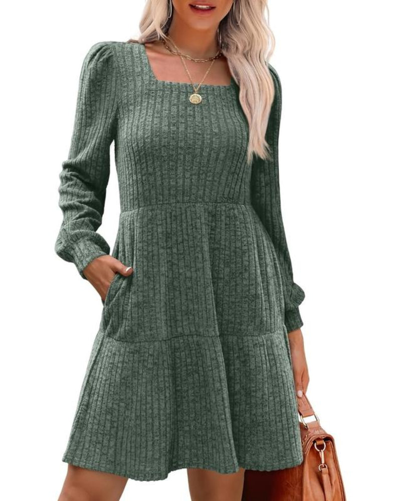 Womens Square Neck Long Sleeve Fall Dresses Casual Babydoll Sweater Dress
