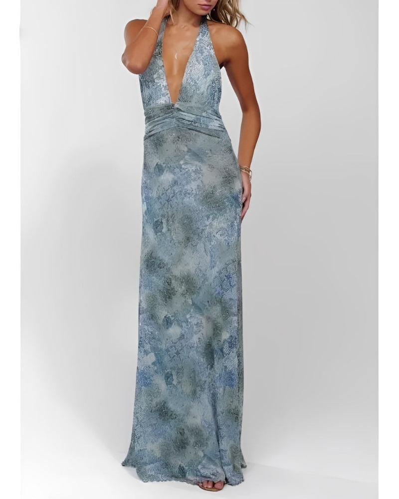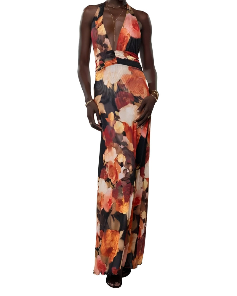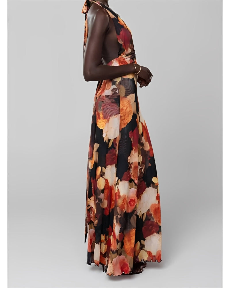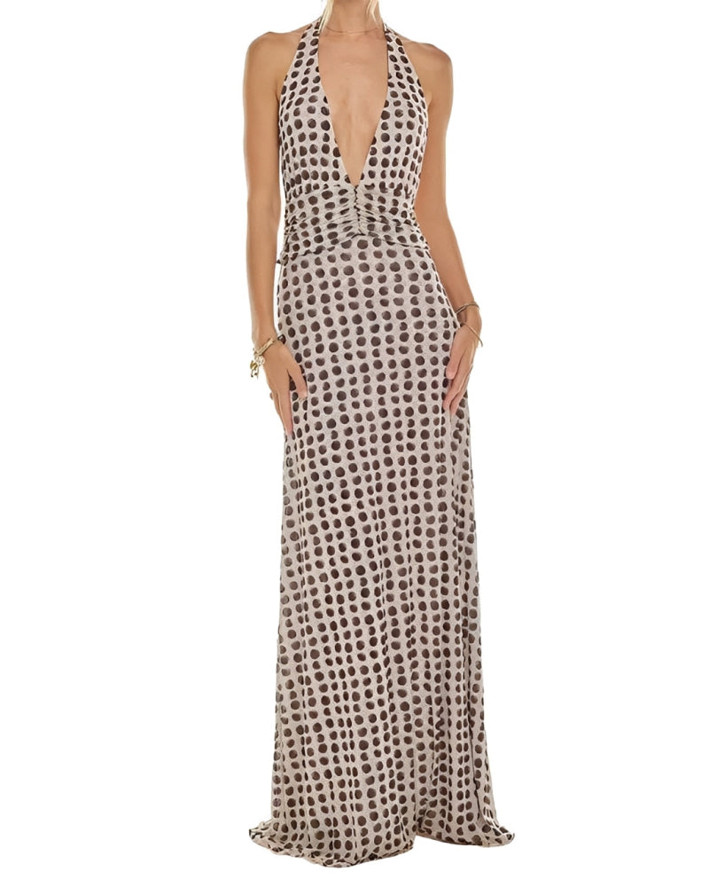 Womens Halter Backless Floral Dot Maxi Dress